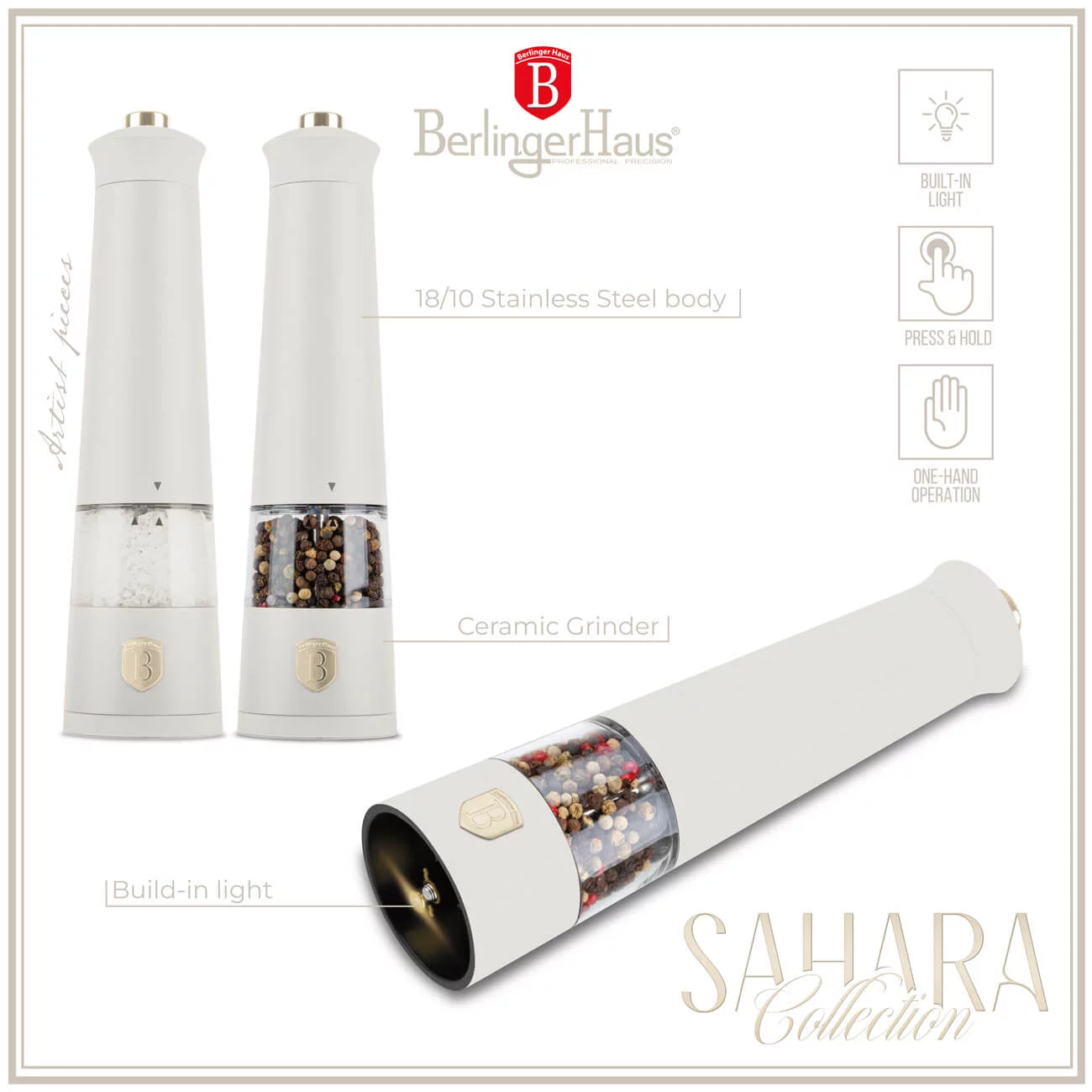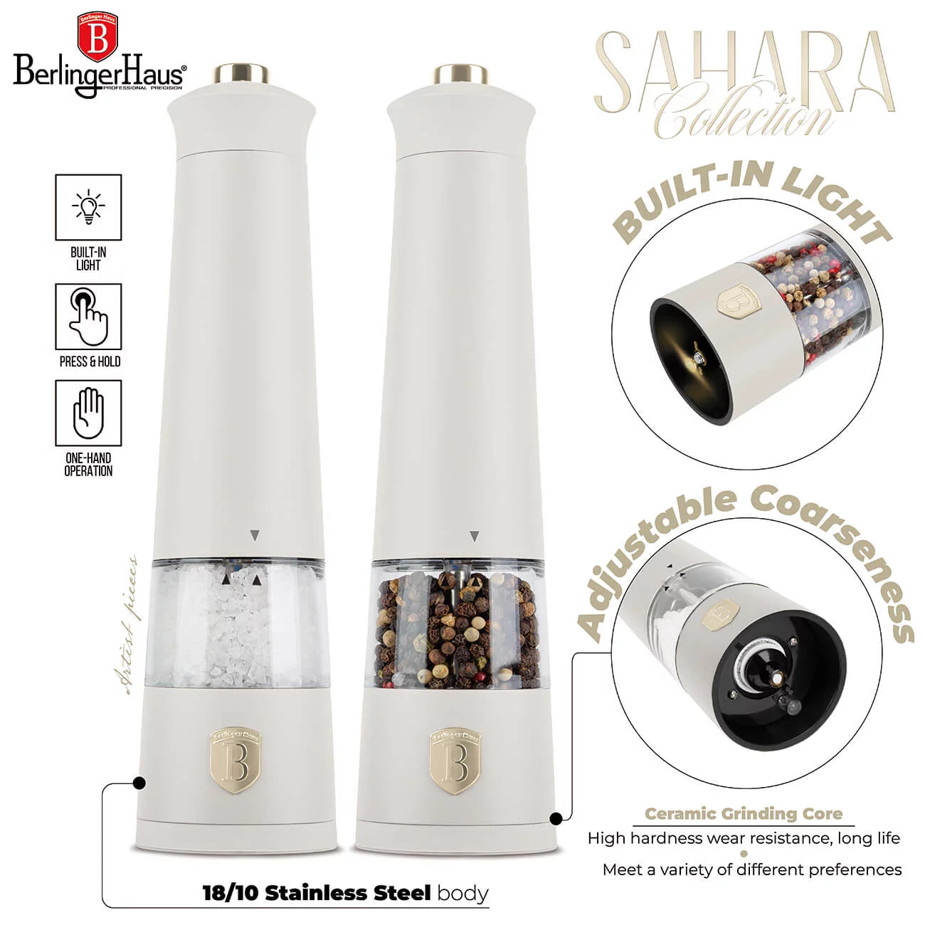 Berlinger Haus Sahara Sähköinen Myllysarja on täydellinen valinta sekä maulle että tyylille. Paranna kulinaarista kokemustasi tuotteella, joka yhdistää huippuluokan käsityön ja esteettisesti miellyttävän muotoilun. Inspiroidu tutkimaan uusia makuja ja nosta ateriasi uudelle tasolle.